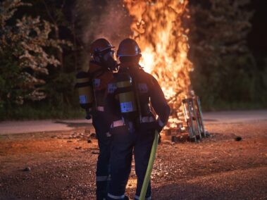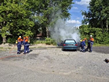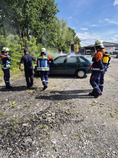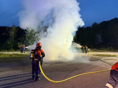 Anschließend stand Dienstsport auf dem Plan, der hinterher mit einer Runde Eis belohnt wurde. Kurz danach folgte der nächste Einsatz. Ein PKW-Brand im Industriegebiet musste unter Atemschutz gelöscht werden. Nach einer kurzen Pause folgte eine Praxis-Ausbildung zum Thema Fettbrand. Anschließend wurde gegrillt und gespannt auf den nächsten Einsatz gewartet. In der Abenddämmerung mussten zwei gestürzte Personen nach einem Radunfall im Bike-Park versorgt und an den Rettungsdienst übergeben werden. Hier mussten die Jugendlichen die Einsatzstelle ausleuchten und Tragehilfe leisten. Als gerade alle Fahrzeuge wieder am Standort zurück waren folgte bereits der nächste Einsatz.