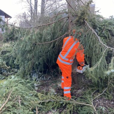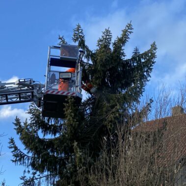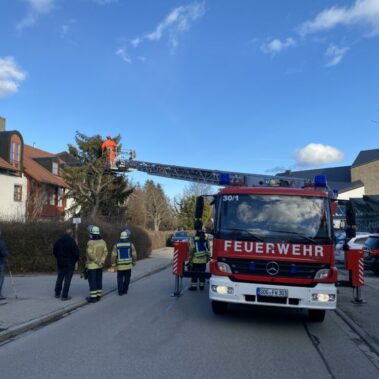 Zu einem Baum der zu fallen droht, wurden wir heute gegenüber der Sparkasse in Schongau West gerufen. Mittels der Drehleiter und der Kettensäge wurde der Baum von oben herab abgeschnitten. Nach kurzer Zeit konnten die Kräfte von Florian Schongau zurück zu ihrem Standort fahren.