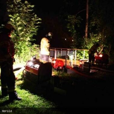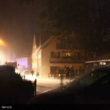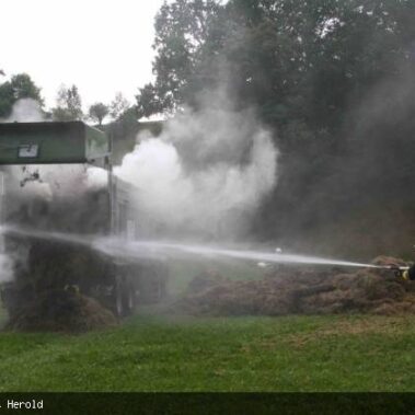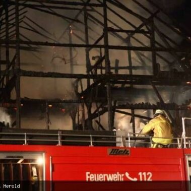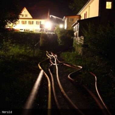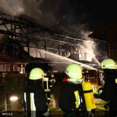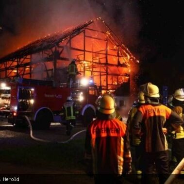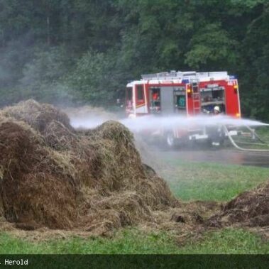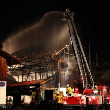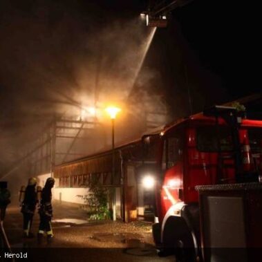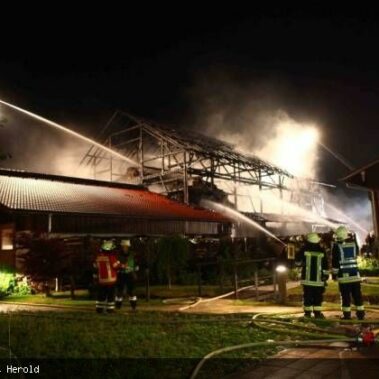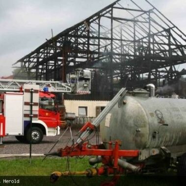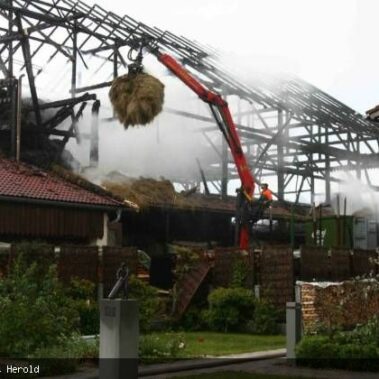 Die Feuerwehren Schongau, Peiting, Herzogsägmühle und Altenstadt wurden am 13.08.2013 gegen 01:22 Uhr zum Brand eines landwirtschaftlichen Anwesens im Papiermacherweg in Schongau gerufen. Der Stall befand sich beim Eintreffen der Einsatzkräfte bereits im Vollbrand. Maschinen und ein Großteil der Tiere konnten gerettet werden, für drei Kälber kam leider jede Hilfe zu spät. Dank des massiven Einsatzes war der Brand schnell unter Kontrolle. Ein Übergreifen auf angrenzende Gebäude, u.a. eine Einrichtung für Senioren, konnte verhindert werden. Das BRK versorgte und betreute neben den Einsatzkräften die unmittelbaren Nachbarn. Als es bereits hell wurde begannen die Nachlöscharbeiten und das Ausräumen des Heustocks. Dieser wurde ausserhalb des Wohngebietes von der Werkfeuerwehr Herzogsägmühle in mühevoller Kleinarbeit abgelöscht; später unterstützte dabei ein weiteres Fahrzeug der Feuerwehr Stadt Schongau. Bis Mittag konnten die letzten Löscharbeiten abgeschlossen werden. Ein Großteil der Einsatzkräfte war zu diesem Zeitpunkt über 30 Stunden „auf den Beinen“ und hatte, aufgrund eines weiteren Einsatzes vor dem Großbrand, lediglich wenige Minuten geschlafen. Trotzdem musste die Einsatzbereitschaft im Anschluß wieder hergestellt werden.