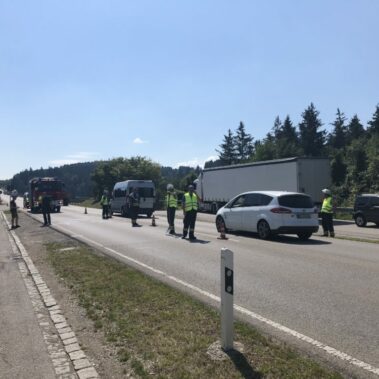 Die Feuerwehr Stadt Schongau wurde am 25.07.2018 um 10:36 Uhr gemeinsam mit der Feuerwehr Peiting zu einem Verkehrsunfall auf die B17 gerufen. Hier war ein Transporter auf einen PKW aufgefahren. 2 Verletzte Personen wurden durch den Rettungsdienst versorgt. Die Einsatzstelle wurde abgesichert und auslaufende Betriebsmittel aufgenommen. Die Feuerwehr Peiting wurde bei Anfahrt auf einen weiteren Unfall auf der B17 aufmerksam und übernahm dort die Erstversorgung und die Absicherung der Einsatzstelle.