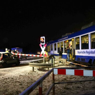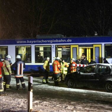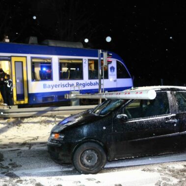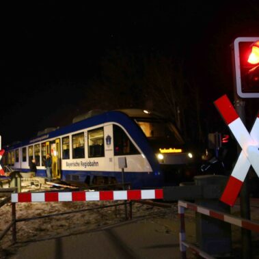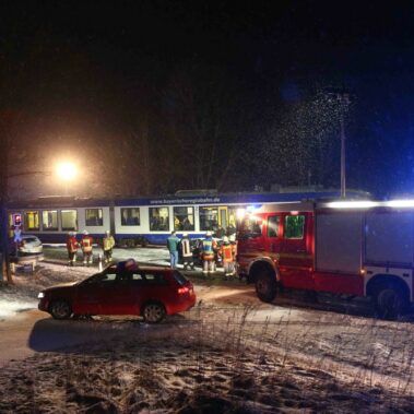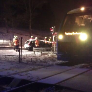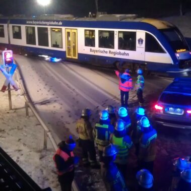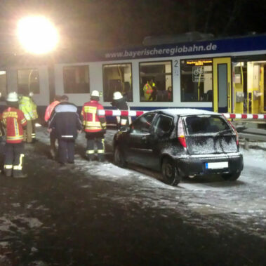 Die Feuerwehren Schongau, Herzogsägmühle und Peiting wurden am 19.02.2016 um 22:13 zum Bahnübergang zwischen Peiting und Schongau gerufen. Dort war ein PKW mit einem Zug zusammengestoßen. Zum Glück ging dieser Unfall glimpflich aus und es entstand kein größerer Personenschaden.