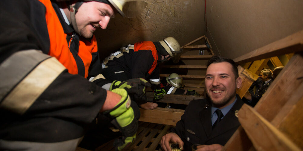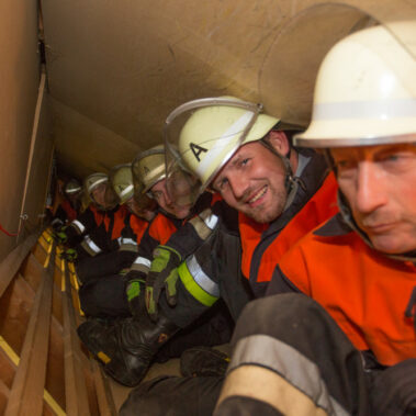 Neun Floriansjünger mussten zusammen mit Schirmherr Falk Sluyterman etliche Prüfungen bestehen, um die Nachbarn zur Übernahme der Patenschaft beim 150-jährigen Jubiläum zu bewegen. In voller Montur ging es durch die Kriechstrecke, die normalerweise zur Atemschutzausbildung genutzt wird. Und damit keiner im engen, dunklen Tunnel stecken blieb oder verloren ging, musste zeitgleich der Schirmherr strampeln, was das Zeug hält, um Strom für die Beleuchtung des Tunnels zu erzeugen.