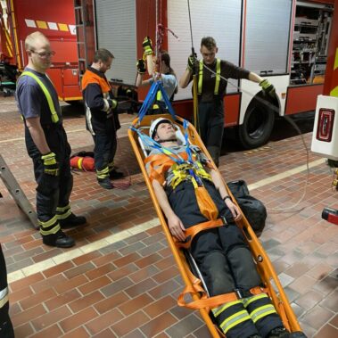 Nachdem die Feuerwehrleute die Schleifkorbtrage und die Sicherungstechnik vorbereitet hatten, wurde eine Person in einer simulierten Notsituation gerettet. Hierbei wurde besonders auf die Technik und Zusammenarbeit geachtet, um ein reibungsloses Vorgehen zu gewährleisten.
