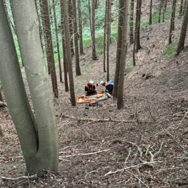 Nachdem die Person die gestürzt war im Hang lokalisiert wurde, machten sich zwei Personen der Absturzsicherung auf, um den Patienten zu betreuen. Derweil wurde die Schleifkorbtrage vorbereiten und den Hang zum Patienten hinab gelassen.