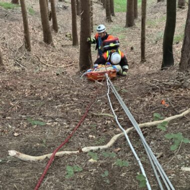 Nachdem der Patient in die Schleifkorbtrage verlagert wurde, konnte dieser über unser Skylotec-System hochgezogen werden.